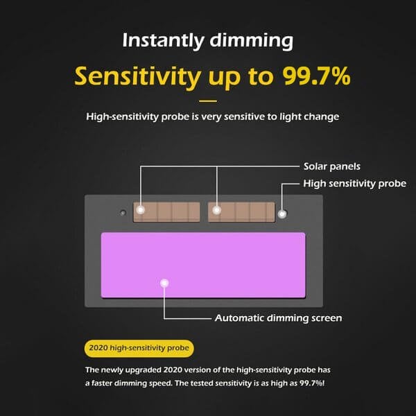 🥽Diseño de atenuación automática: El filtro de atenuación automática cambia automáticamente de un estado brillante a un estado oscuro cuando se genera un arco, y vuelve a un estado brillante cuando la soldadura se detiene, proporcionando a cada trabajador una visión clara para liberar sus manos