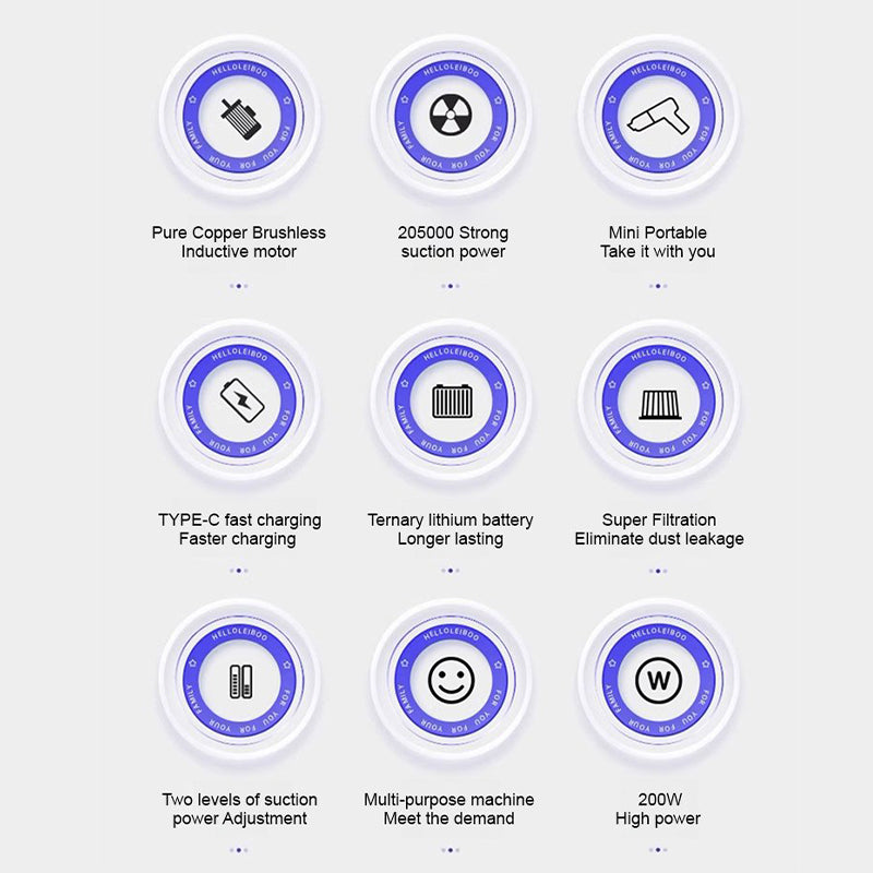 El paquete incluye: 1* Aspiradora portátil multifuncional potente, 1* Boquilla larga, 1* Boquilla de cepillo, 1* Cable de carga, Manual, Secador de pelo
