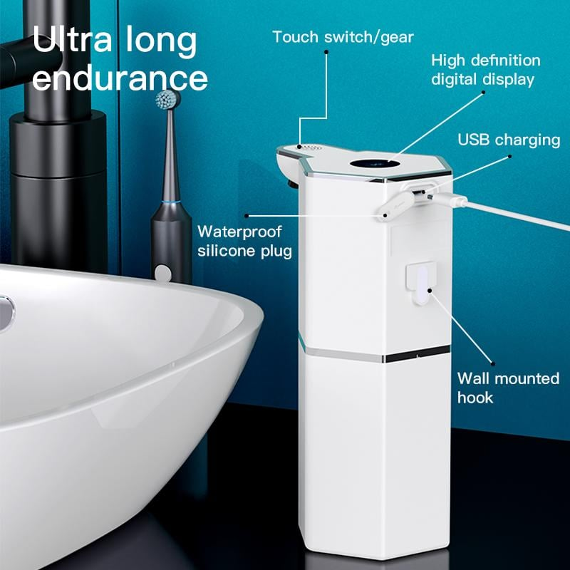 CUATRO MODOS DE SALIDA DE ESPUMA Y PANTALLA DIGITAL: El dispensador cuenta con cuatro modos de salida de espuma para dispensar jabón de forma personalizada. La pantalla digital muestra el modo y el nivel de batería, lo que facilita el control y el ajuste de la configuración según sea necesario.