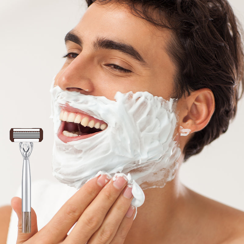 CONVENIENTE JUEGO DE AFEITADO TODO EN UNO- Incluye 1 mango de afeitar plateado duradero, 6 cuchillas de recambio, un práctico estuche y 1 tubo de crema de afeitar. Una solución de afeitado completa para satisfacer todas sus necesidades.