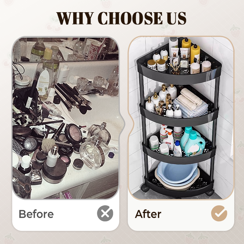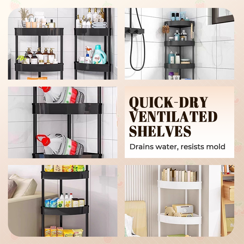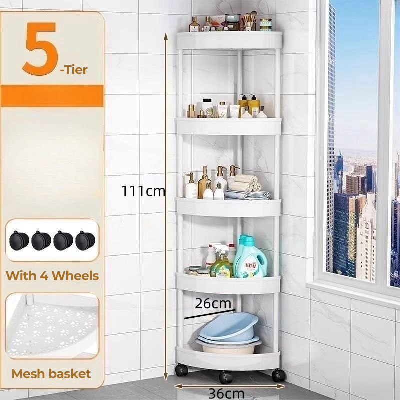 DISEÑO AHORRADOR DE ESPACIO EN ESQUINAS: Con estructura en ángulo de 90°, esta estantería encaja perfectamente en esquinas y espacios estrechos, como rincones del baño, bordes de cocina o entradas reducidas. Convierte espacios muertos en almacenamiento funcional, maximizando la eficiencia sin comprometer la accesibilidad ni la estética.